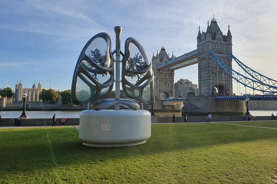 16ft tall dynamic lung model. the lungs displayed air quality figures with LED matrices using real time data of Particulates in the air on certain london streets. when the amounts reached harmful levels, coloured smoke was released into the ‘lungs’.